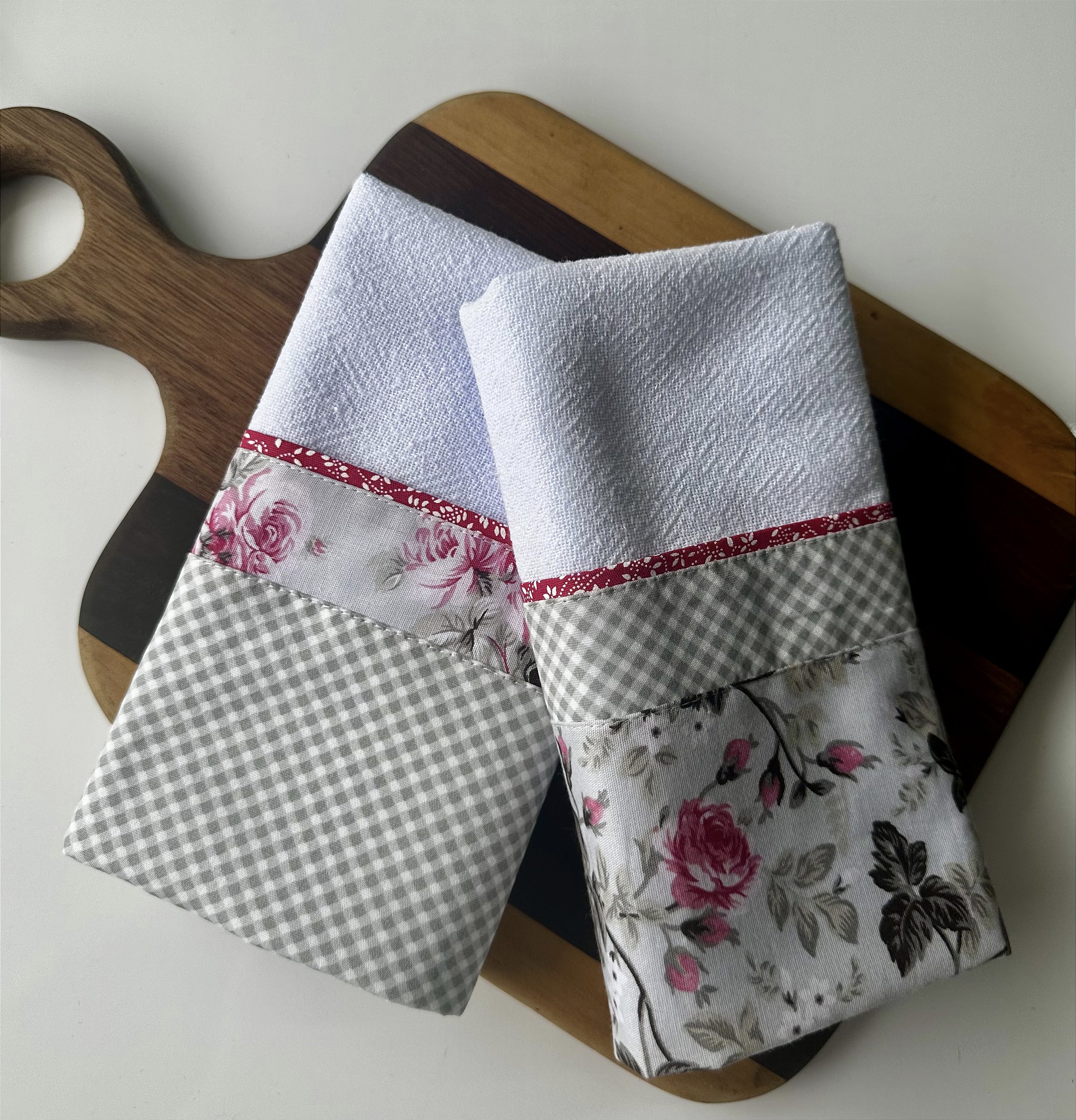 Conjunto com 2 panos de prato com barrado triplo em tricoline e caixa para presente.