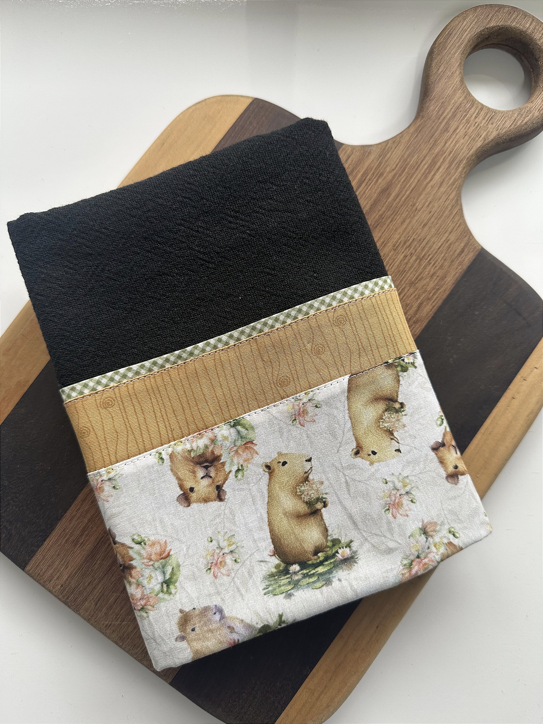 Pano de prato PRETO com barrado em tricoline. Ideal para churrasqueira e área gourmet.
