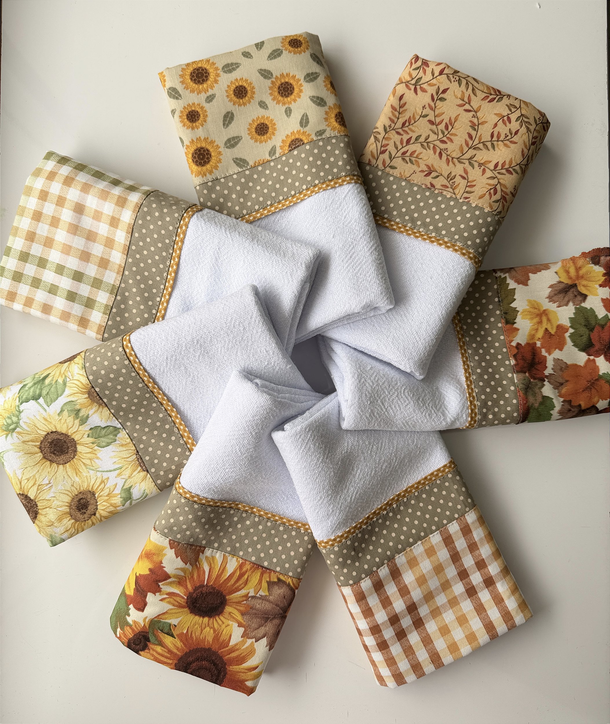 Conjunto com 7 panos de prato com barrado triplo em tricoline. Estampas variadas.