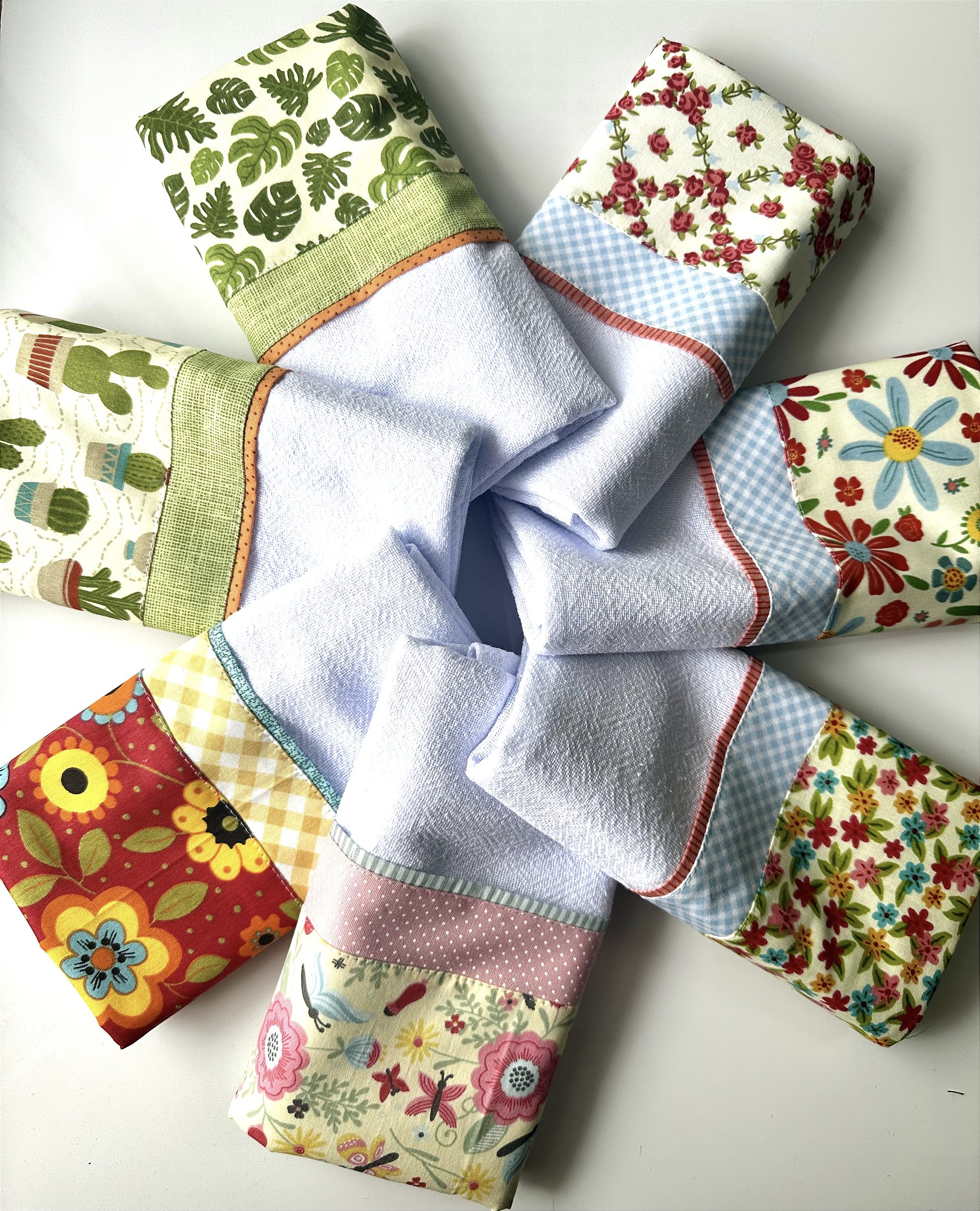 Conjunto com 7 panos de prato com barrado triplo em tricoline. Estampas variadas.