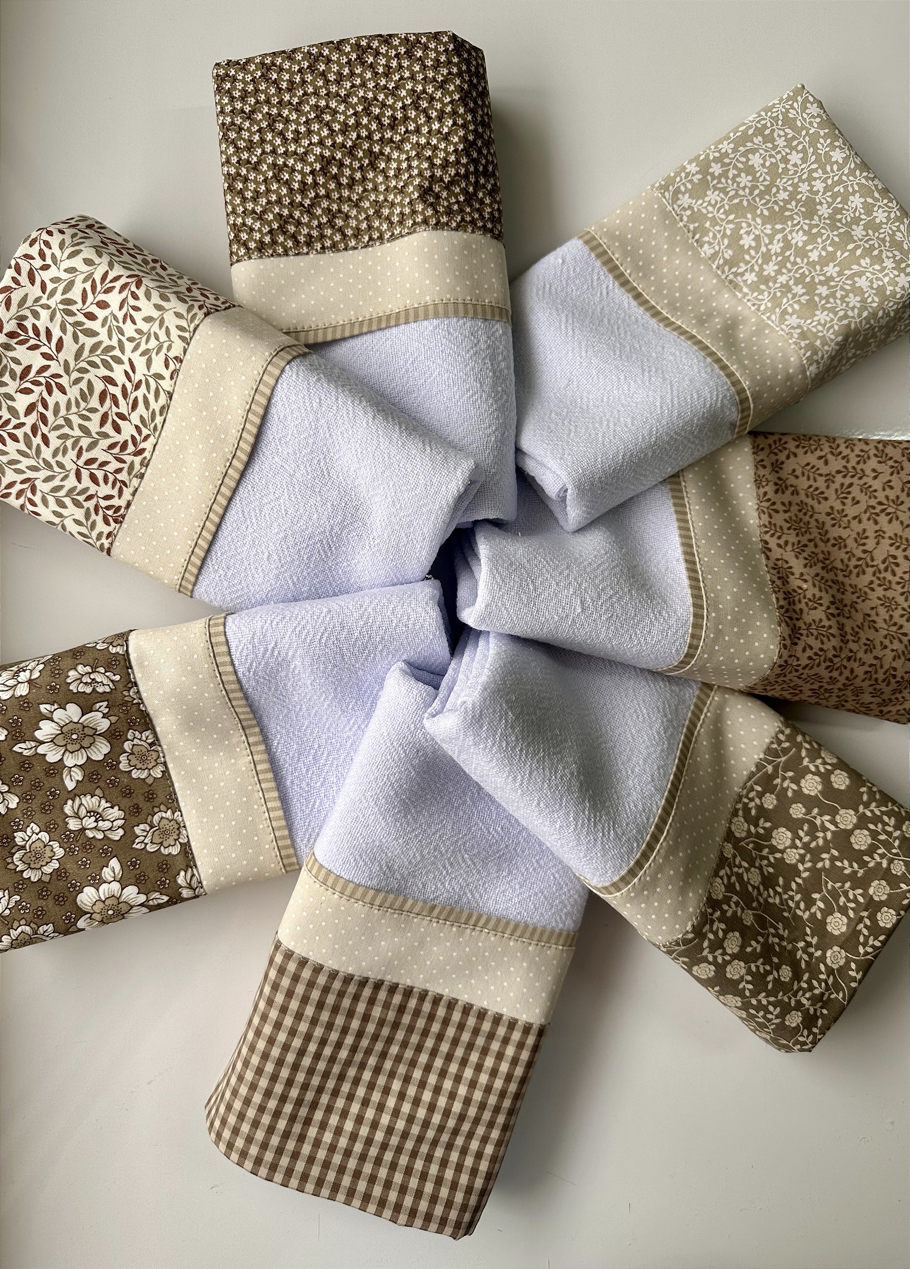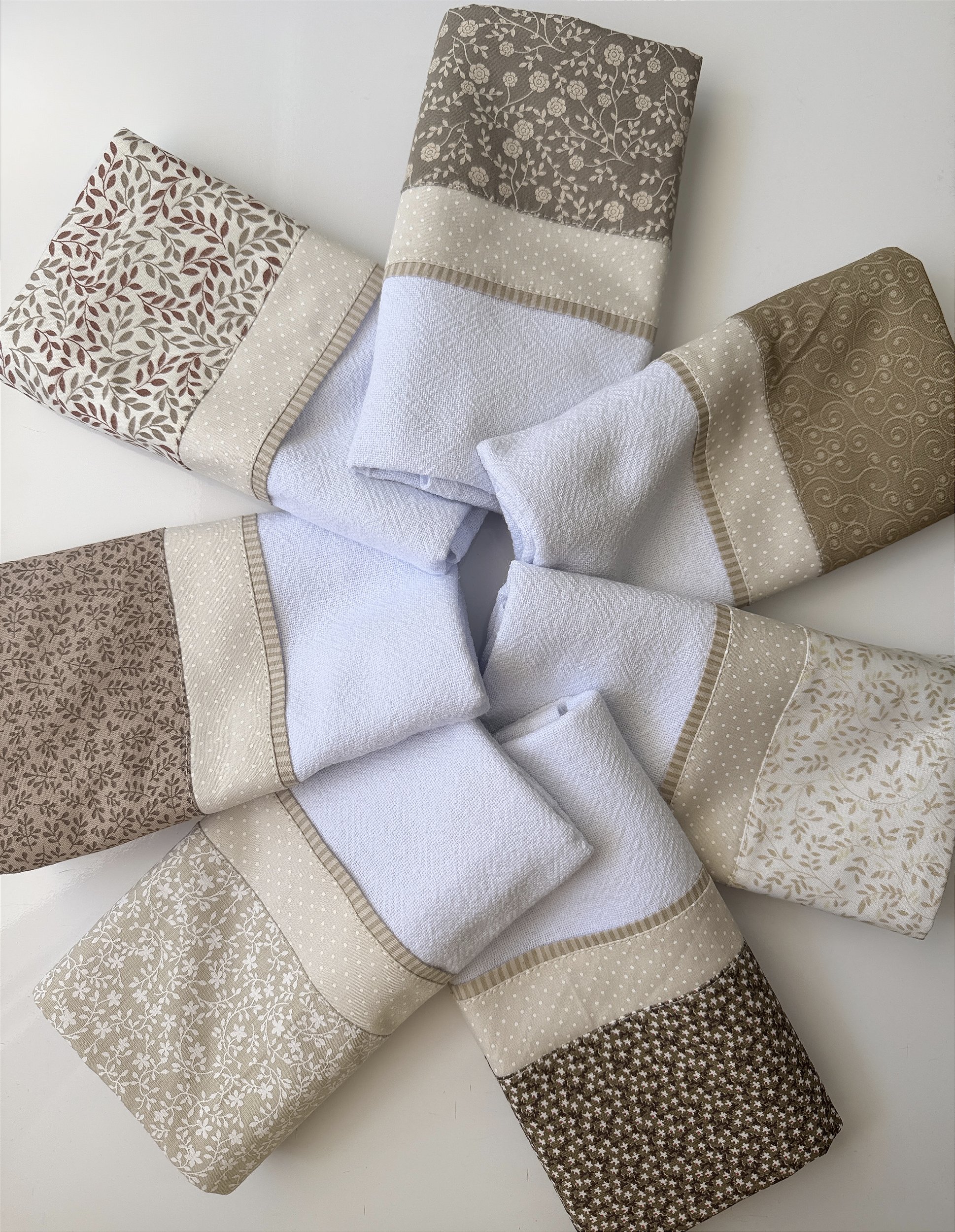 Conjunto com 7 panos de prato com barrado triplo em tricoline. Estampas variadas.