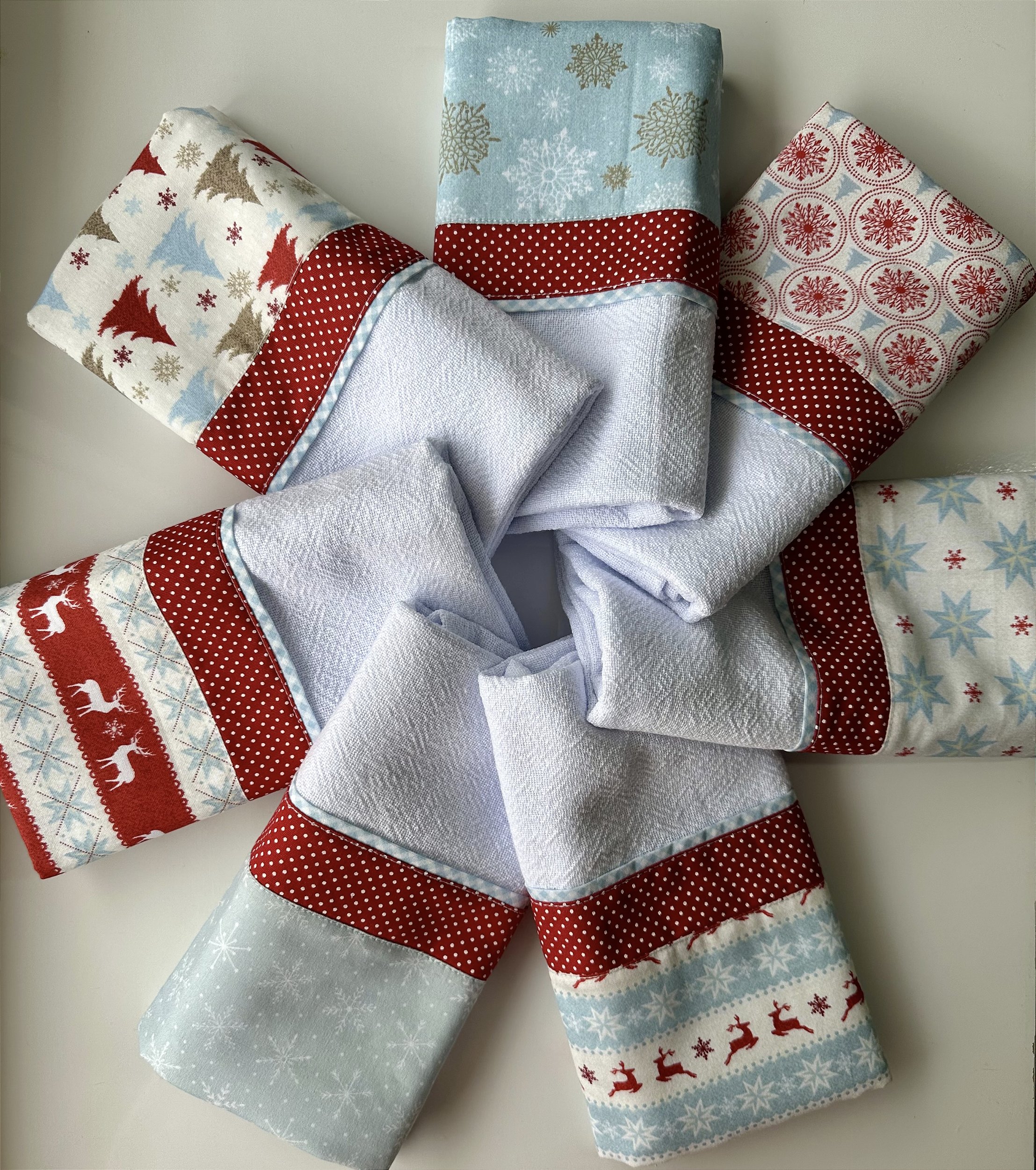 Conjunto com 7 panos de prato com barrado triplo em tricoline. Estampas variadas.